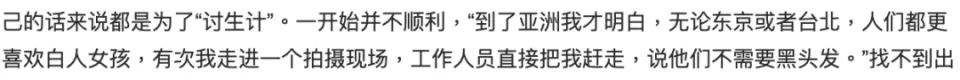 ▲ “到了亚洲我才明白,大家都更喜欢白人女孩,有次我走进拍摄现场,工作人员直接把我赶走,说他们不需要黑头发。”图源水印
