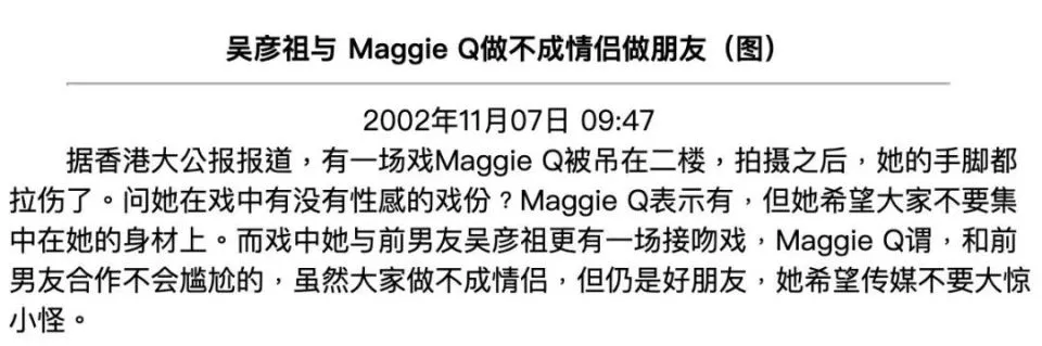 2000年,Maggie Q果断向吴彦祖提出分手,就这样,这对金童玉女的恋情只维持了短短两年便宣告结束。