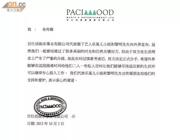 ▲ 2012年,黎明与乐基儿公开发表离婚声明,观念传统的黎明和从小在美国长大、凡事以自己为主的乐基儿,会因为理念“严重分歧”而离婚,也算是情理之中了。图源水印