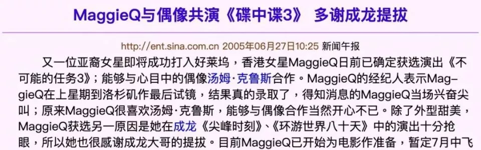▲ 一入行就得到成龙的栽培,在那个亚洲女明星对好莱坞趋之若鹜的时代,Maggie Q轻而易举地得到了出演《碟中谍》这样可遇不可求的机会,不得不感叹,Maggie Q的星运真是无人可比。