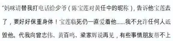 在生命的最后时刻,陈宝莲仍然心系着她的“挚爱”黄任中。陈宝莲的母亲公开了部分遗书,其中写道: