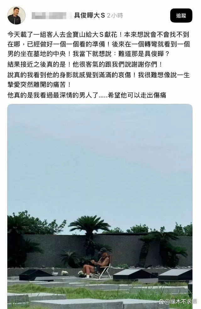 27日,一位台湾的士司机在为一组乘客送花前往金宝山祭拜大S时,偶然在某个墓地前看到具俊晔。鉴于大S的墓地尚未对外公布,司机一开始并未认出他,只知道他正在慢慢寻找。而当他看到具俊晔的背影时,便被那凄凉的气质深深打动。据司机描述,具俊晔的神色极为哀伤,几乎令人心碎。