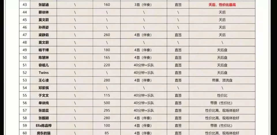 整体来说对比内地当红流量,港台女歌手的商演真的很有性价比,被评有性价比的女歌手有张韶涵、于文文115W演唱40分钟,张靓颖演唱4首280W。陈嘉桦100W演唱4首。