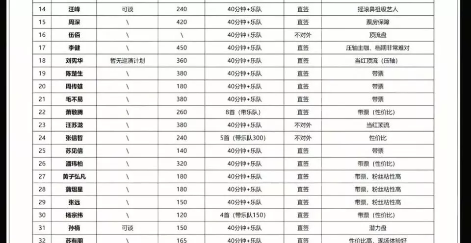 周传雄、萧敬腾、张信哲、苏见信、杨宗纬、苏有朋、吴克群,这些歌手就是赤裸裸的案例,出场费价格基本都在100-250W之间,最高的是张信哲在240W,苏有朋比较低在165W,吴克群更低只要100W。