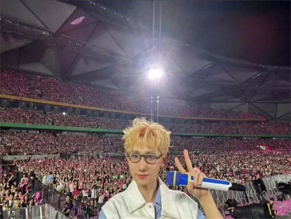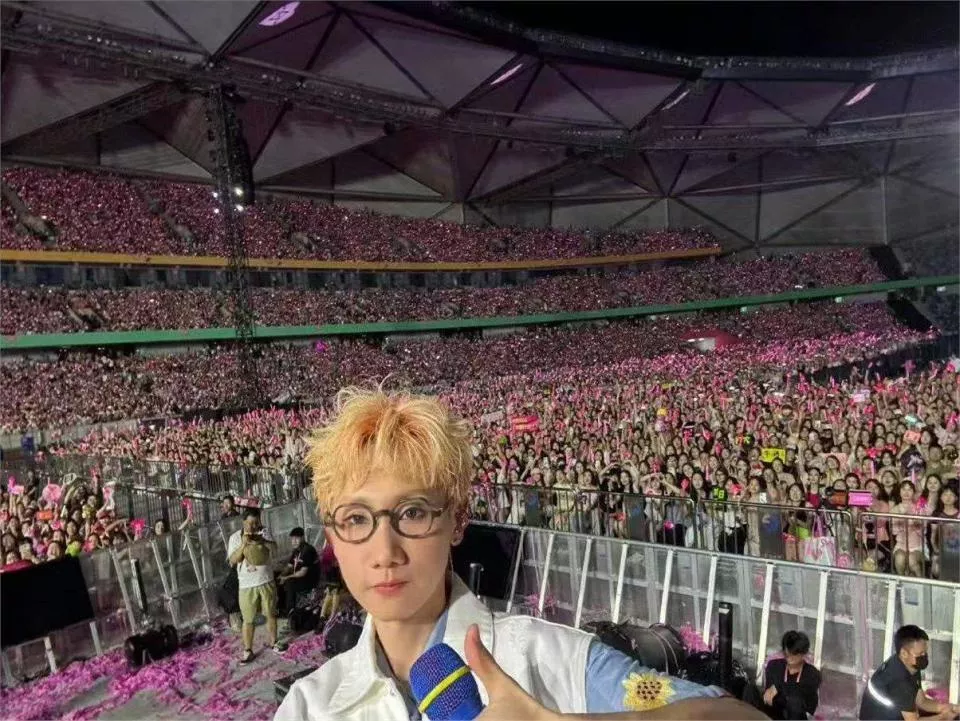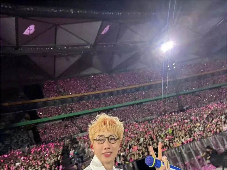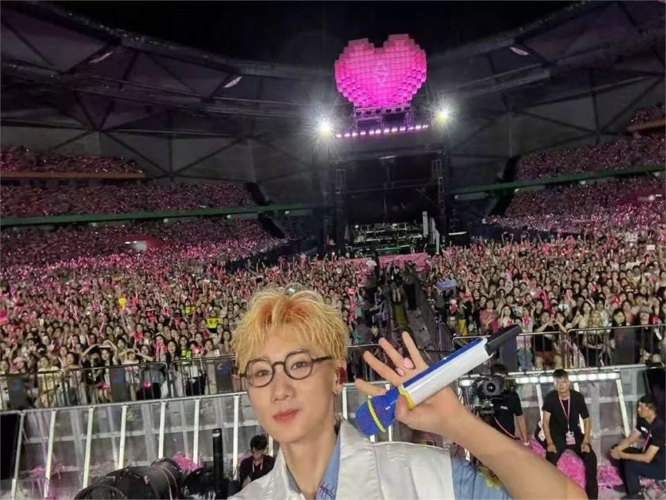 照片中,他站在台上,台下粉丝座无虚席,人人手持粉色应援棒,一大片望去宛如粉色花海,美极了。他站在台上,背向粉丝,举起相机拍照,如此便能将粉丝都收入镜头。