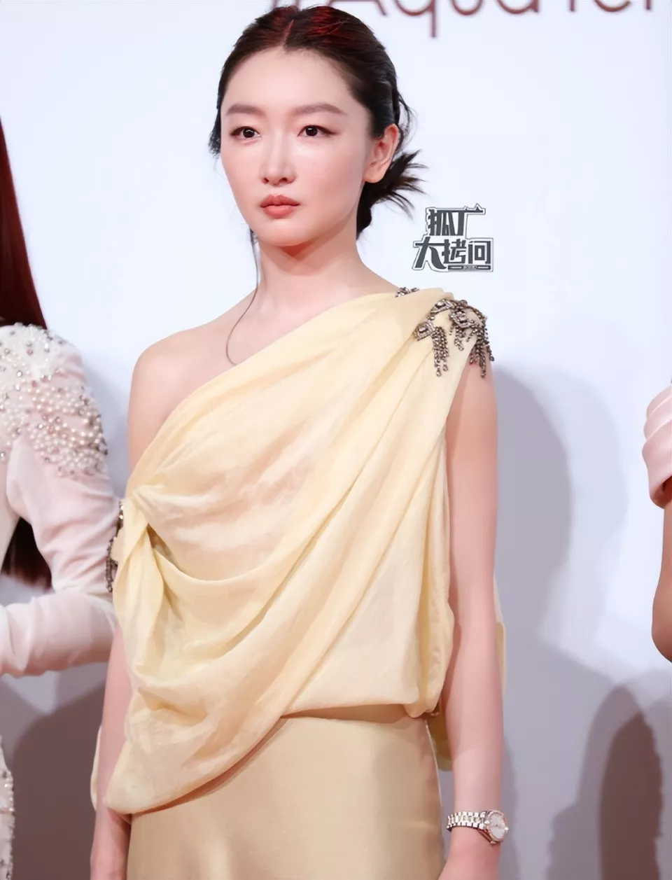 而这次她选择的明黄色斜肩长裙就不太适合她,上半身纱质的面料给人一种廉价纱巾的质感,堆叠的褶皱既没有突显腰线,还格外累赘。