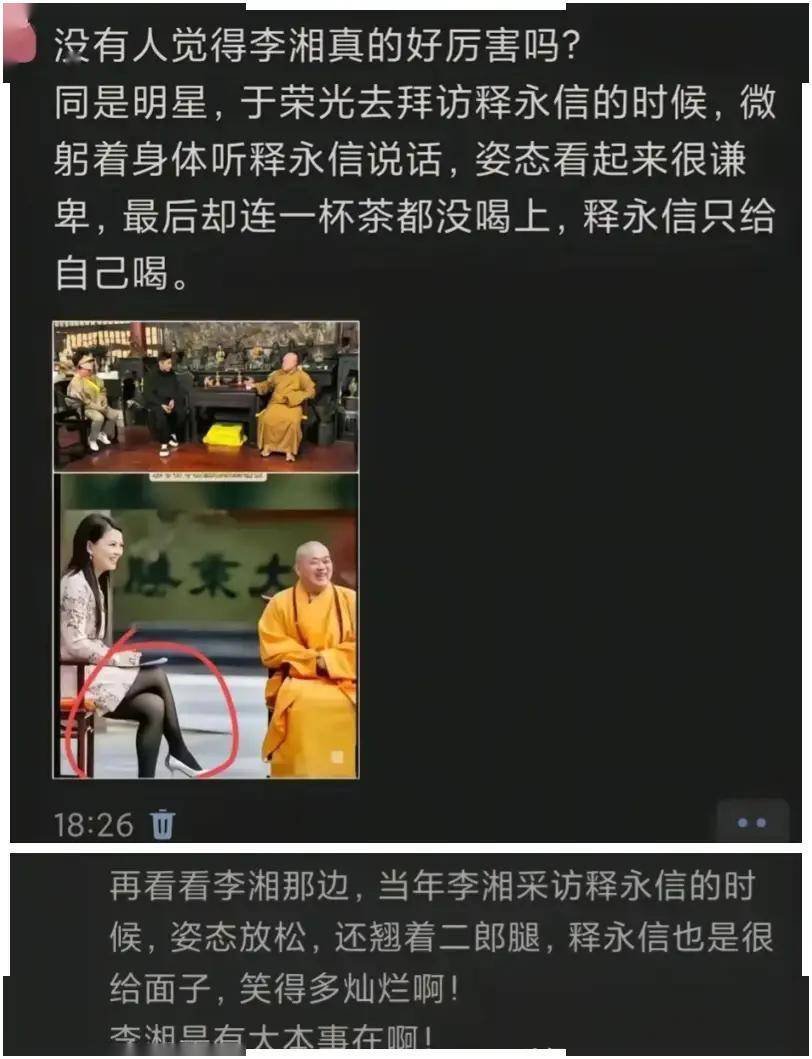 而李湘则是穿着光鲜,翘着二郎腿,释永信也笑脸相迎,开怀大笑。
