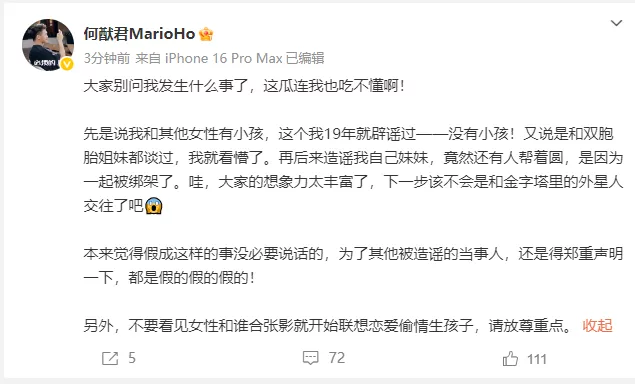 估计是这次谣言的对象是自己的亲妹妹,何猷君很快就出来回应了。7月31日下午,他发文澄清,语气那叫一个高情商,完全没有暴跳如雷的样子: