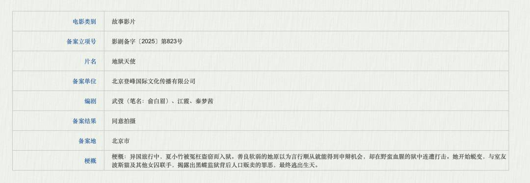 吴京的登峰国际曾公布正在筹备一部女性题材电影《地狱天使》,如今该片通过立项,编剧组合包括俞白眉以及《传闻中的陈芊芊》《以美之名》的两位女性编剧江霞、秦梦茜。