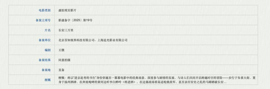 据立项备案的梗概介绍,虚拟现实影片版《长安三万里》将以“进京赶考的书生”身份穿越至一幕幕电影中的经典场景,深度参与剧情的发展,与诗人们共同开启跨越时空的冒险。