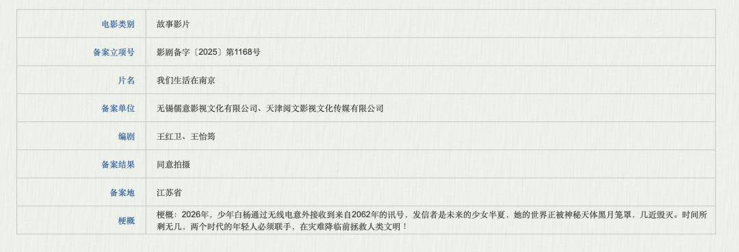 《我们生活在南京》讲述“2026年,少年白杨通过无线电意外接收到来自2062年的讯号,发信者是未来的少女半夏,她的世界正被神秘天体黑月笼罩,几近毁灭。时间所剩无几,两个时代的年轻人必须联手,在灾难降临前拯救人类文明!”