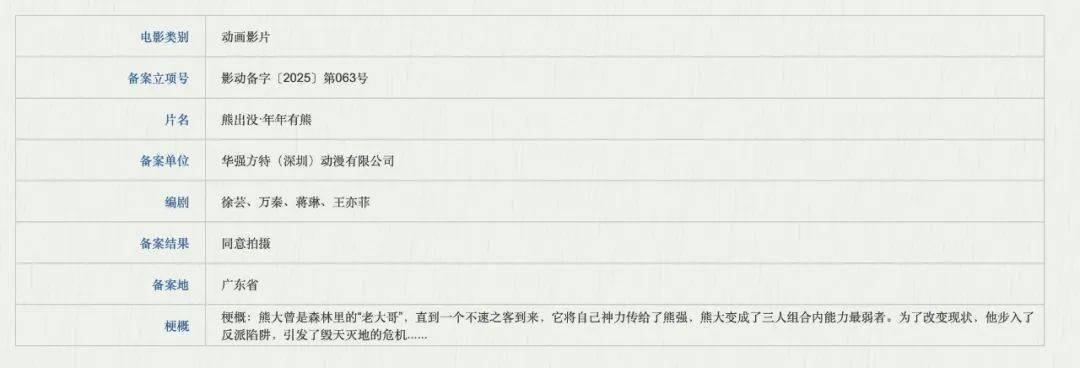 华强方特立项通过《熊出没·年年有熊》,《熊出没》系列电影连续11年陪伴观众度过春节,累计总票房超过85亿,已经成为票房号召力最强的国产动画IP。