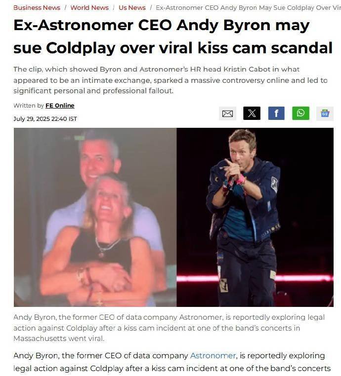 日前,美国波士顿的一场酷玩乐队演唱会上,美国一家科技公司的CEO安迪·拜伦与人力资源主管克里斯汀·卡伯特的亲密举动被“亲吻镜头”(Kiss Cam)捕捉,两人发现被投屏后惊慌躲避,主唱克里斯·马丁调侃:“他们要么在出轨,要么太害羞!这一幕迅速在社交媒体上炸开了锅。