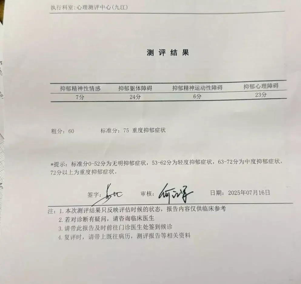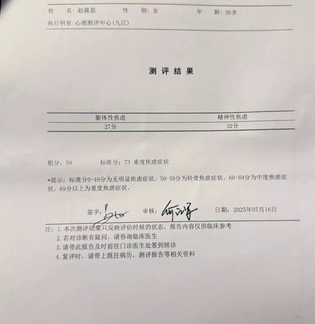 赵露思还晒出了自己的心理测评结果,显示有重度焦虑症和重度抑郁症。