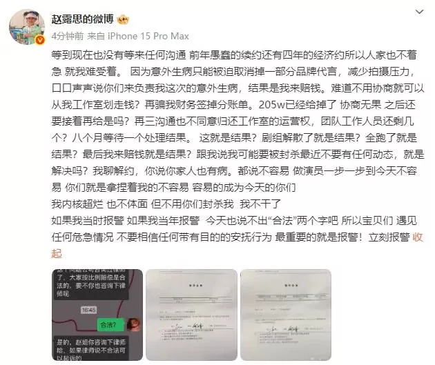 搜狐娱乐讯 2日,赵露思在社交平台上发文怒怼经纪公司“银河酷娱”,她表示:“等到现在也没有等来任何沟通,前年愚蠢的续约,还有四年的经济约,所以人家也不着急,就我难受着。因为意外生病只能被迫取消掉一部分品牌代言,减少拍摄压力,口口声声说你们来负责我这次的意外生病,结果是我来赔钱。难道不用协商就可以从我工作室划走钱?再骗我财务签掉分账单。205w已经给掉了,协商无果,之后还要接着再给是吗?再三沟通也不同意归还工作室的运营权,团队工作人员还剩几个?八个月等待一个处理结果。这就是结果?剧组解散了就是结果?全跑了就是结果?最后我来赔钱就是结果?跟我说我可能要被封杀最近不要有任何动态,就是解决吗?我聊解约,你说你家人也有病。都说不容易,做演员一步一步到今天不容易,你们就是拿捏着我的不容易,容易的成为今天的你们。我内核超烂,也不体面,但不用你们封杀我,我不干了!如果我当时报警,如果我当年报警,今天也说不出‘合法’两个字吧?所以宝贝们,遇见任何危急情况,不要相信任何带有目的的安抚行为,最重要的就是报警!立刻报警!”