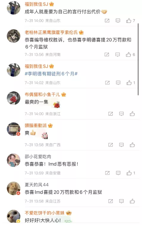 李明德被依法判处有期徒刑6个月,同时需承担20万的民事赔偿责任。这一结果让网友们纷纷拍手称快,直呼大快人心。