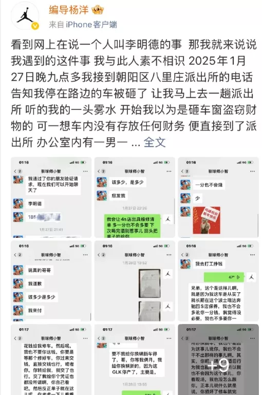 让我们把时间倒回半年前,重新梳理一下李明德砸车事件的来龙去脉。2月1日,杨洋编导发文透露,在2025年1月27日晚九点多,他突然接到派出所打来的电话。电话那头告知他,其停在路边的车遭人砸损,需他尽快前往派出所处理。