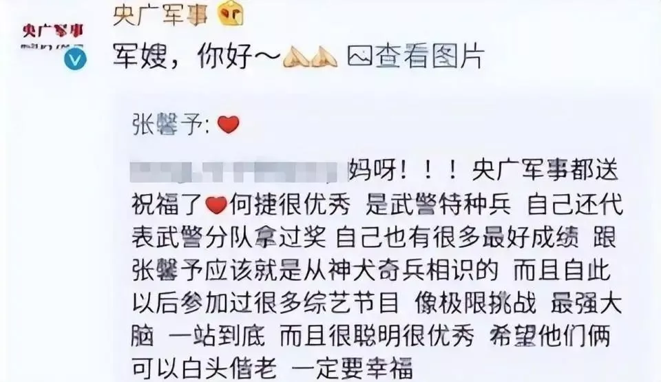 官宣结婚后,有网友发文称张馨予老公何捷是武警特种兵,还拿过奖。该言论获张馨予转发承认,央广军事官微也发文称:“军嫂,你好。”