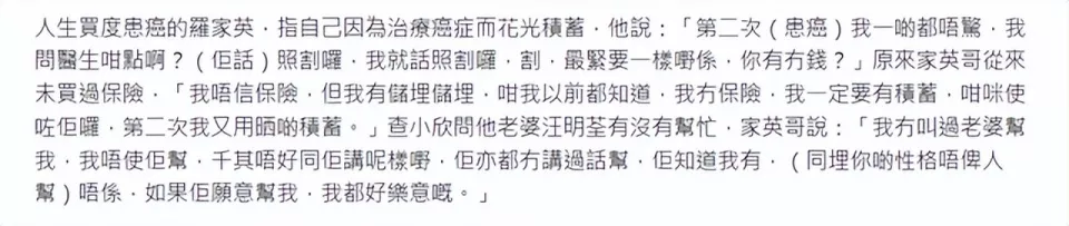 当查小欣问到他的妻子汪明荃有没有帮忙时,罗家英说:“我从来没让老婆帮我,我也不需要她帮。千万别跟她说这些事,她也没提过要帮我。她知道我有钱(能负担医药费)。并不是我不想让人帮,如果她愿意帮我,我当然会很乐意。”