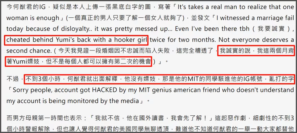 而嫖娼相关的传言则是一直没停过,他本人早年发INS,承认过嫖娼,还说过对不起女朋友Yumi,事后又称是朋友恶搞。也有IP新加坡的网友爆料称他在当地嫖娼出名。