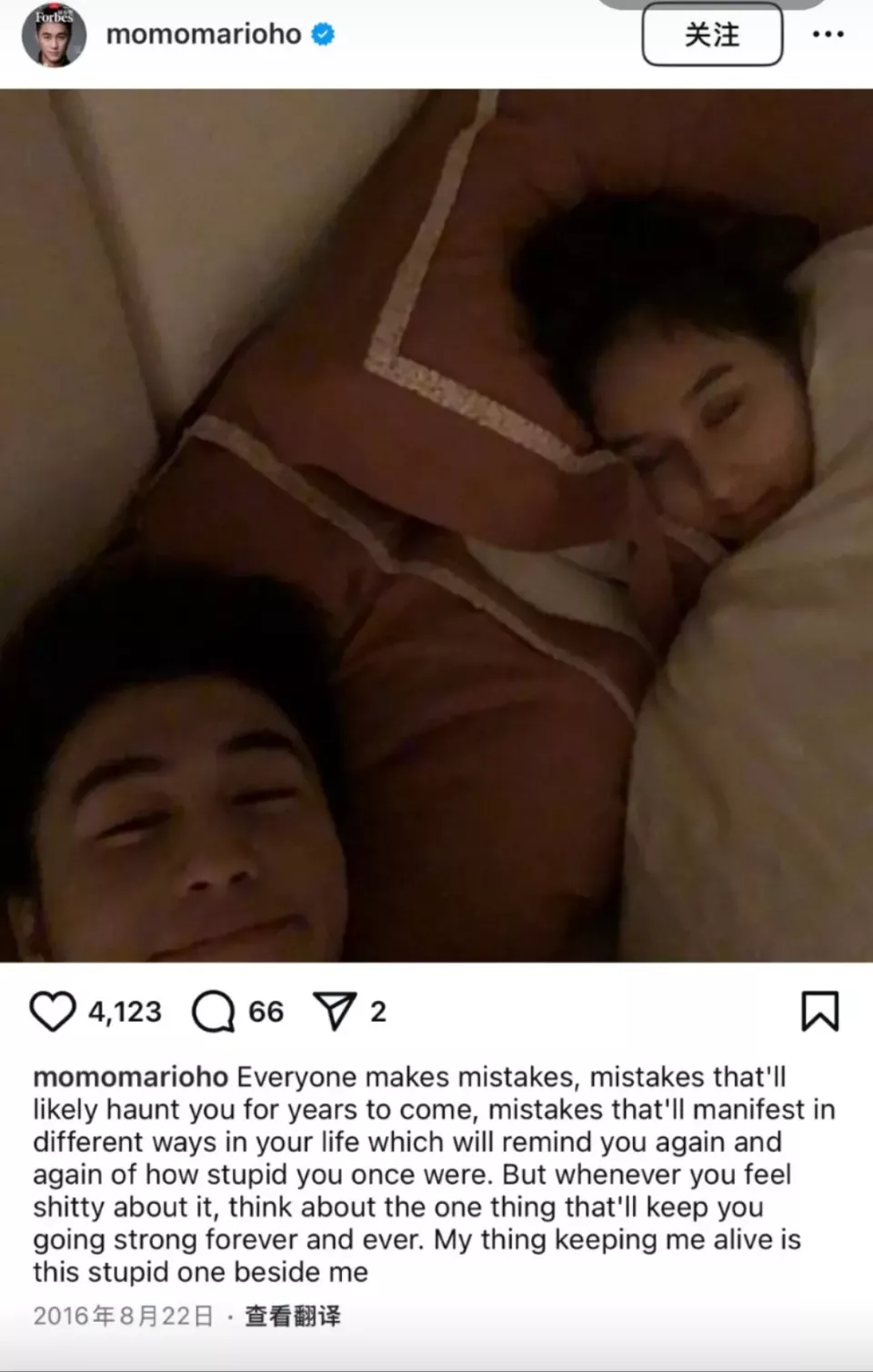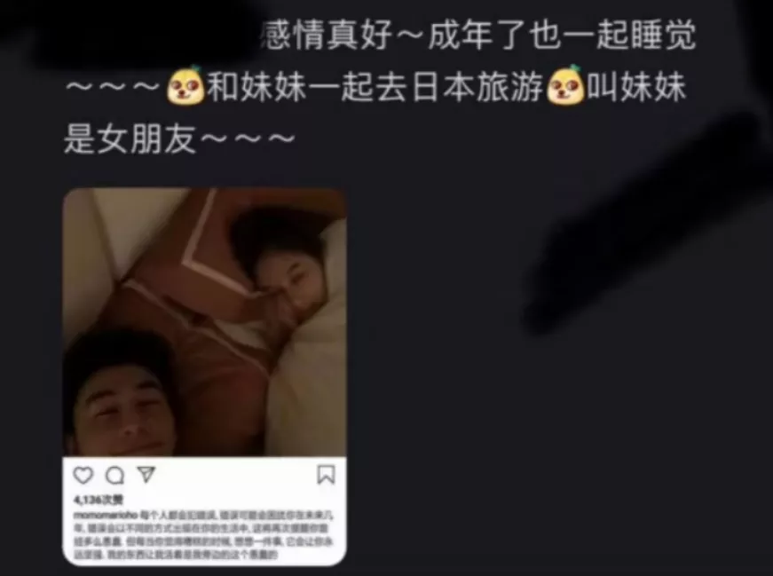 照片中,何猷君和妹妹躺在一张床上,妹妹全素颜熟睡中,身体被被子裹得严严实实,何猷君则以“男友视角”拍了这张合影。配文则并没有提到兄妹相关的话题,只是“人人都会犯错,会被一些愚蠢的错误困扰,但人生往往就是被这些愚蠢支撑”,不知道是意有所指,还是巧合鸡汤。