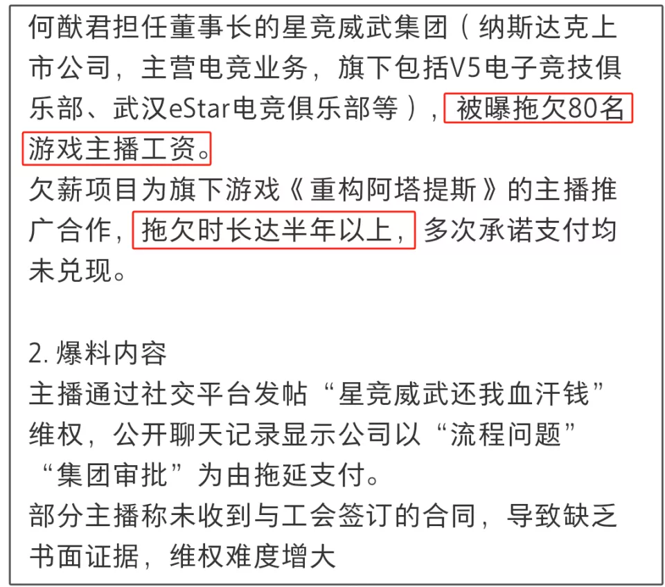先来说欠薪风波,何猷君投资了电子竞技公司,该公司在美上市后市值暴跌,有主播发文爆料称何猷君拖欠游戏主播工资,人数多达80人,拖欠时长长达半年,而拖延的借口则是用“流程问题”、“集团审批”卡人。