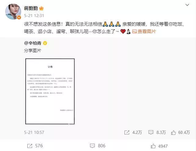朱媛媛去世当日,蒋勤勤又是嘱咐在家的陈建斌去看看,还第一时间发文悼念。