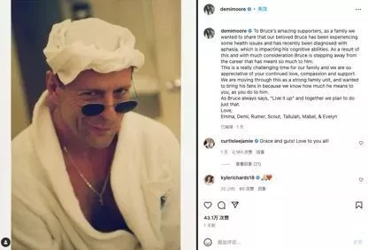 当时布鲁斯·威利斯的家人们联合发布了一份声明,宣布他退出影坛的决定。他们在声明中说,“我们心爱的布鲁斯最近被诊断出患有失语症,这影响了他的认知能力。经过深思熟虑,布鲁斯决定退出他的演艺事业”。