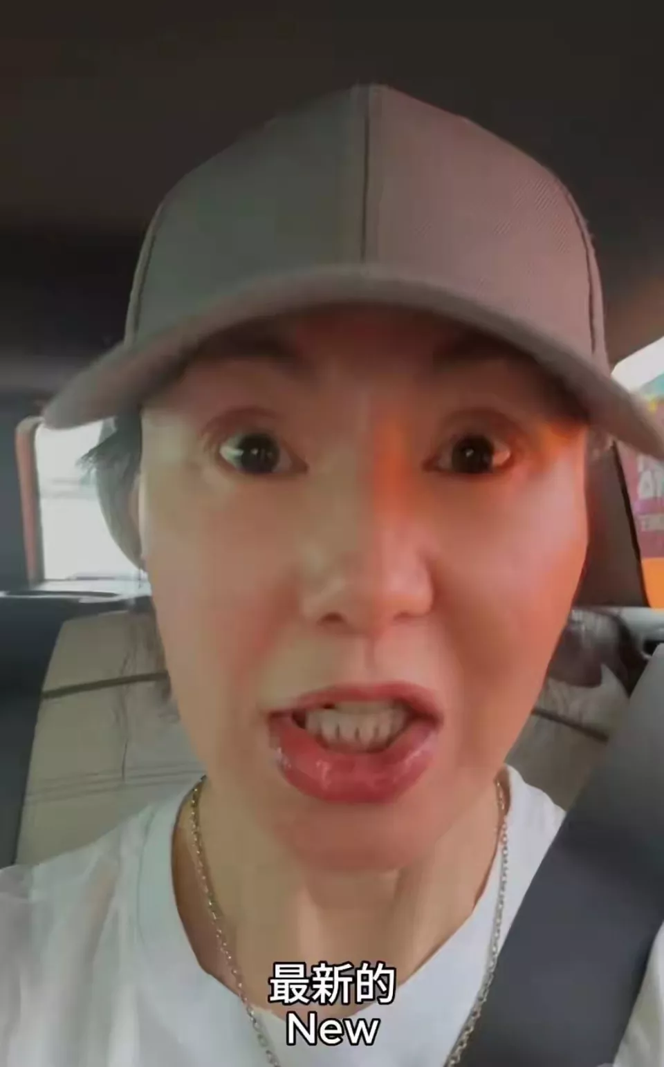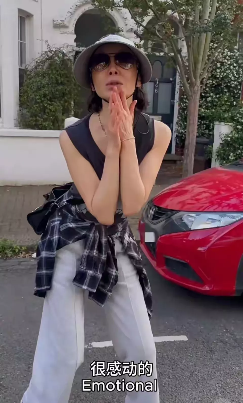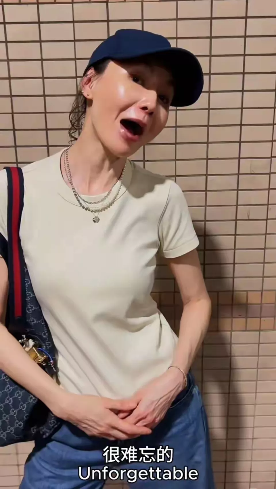 张曼玉上了年纪,更喜欢一些简洁大气的装扮。戴上鸭舌帽、穿着基础款T恤,张大嘴巴的模样也很有趣。