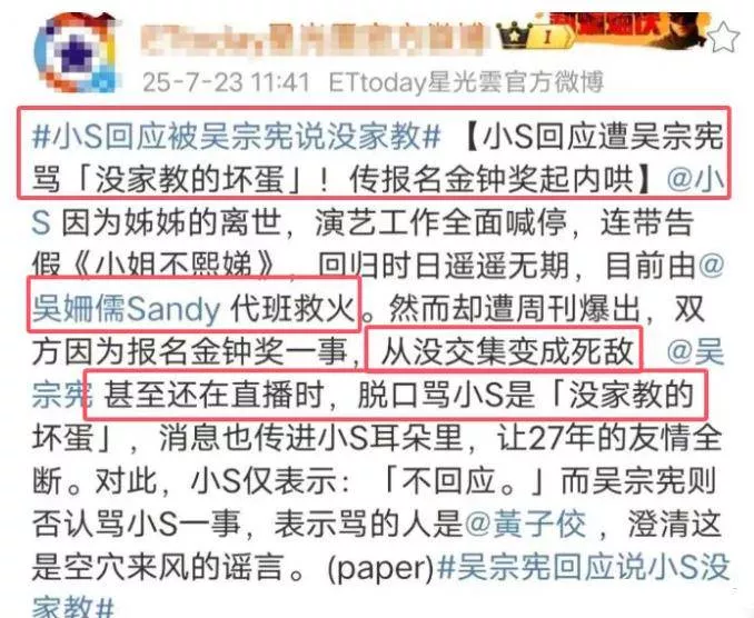 紧接着,吴宗宪又改口说自己骂的不是小S,而是黄子佼。