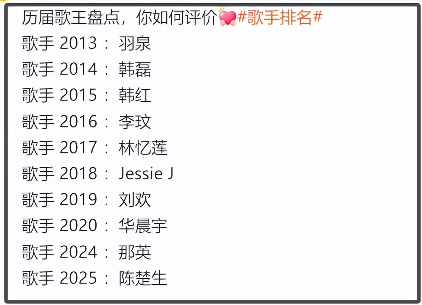 最后放上历届歌王名单,大家觉得陈楚生实至名归吗?