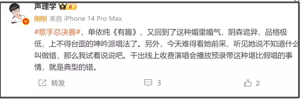 乐评人发文抨击,称她这首歌又回到了这种媚里媚气,阴森诡异,品格极低,上不得台面的呻吟派唱法了。还对她前采产生了很强烈的不满。单依纯采访称不知道什么叫做错,乐评人指出,干出线上收费演唱会播放预录带这种堪比假唱的事情,就是典型的错。也是很扎心了。