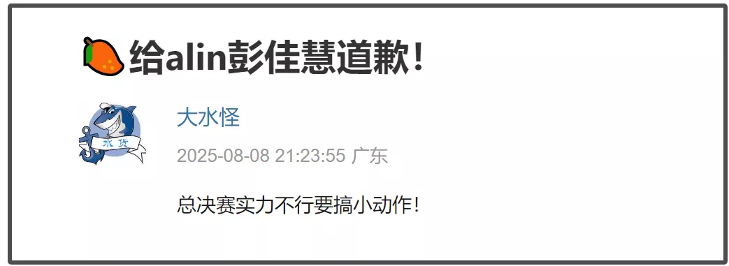 而等A-lin第一轮挂车尾排名第七时,彭佳慧更是抱着A-lin自责落泪,网友纷纷为两人鸣不平,直呼两人被做局了,还有不少网友刷屏要求芒果台道歉。