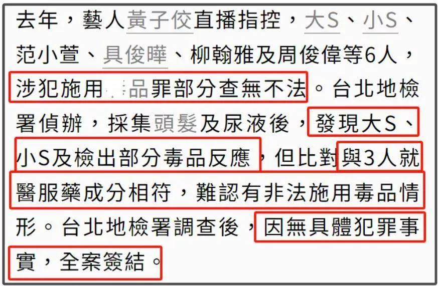 结果黄子佼先爆料的大小S吸毒,没被要求赔偿。后来跟着爆料的葛斯齐却好像成了两姐妹洗白的工具,告葛斯齐胜诉之后,大小S主动做了检测,最后结果是两姐妹检出药物反应,但和就医服药成分相符,难认有非法施用的情形,两人的吸毒丑闻也就到此为止了。