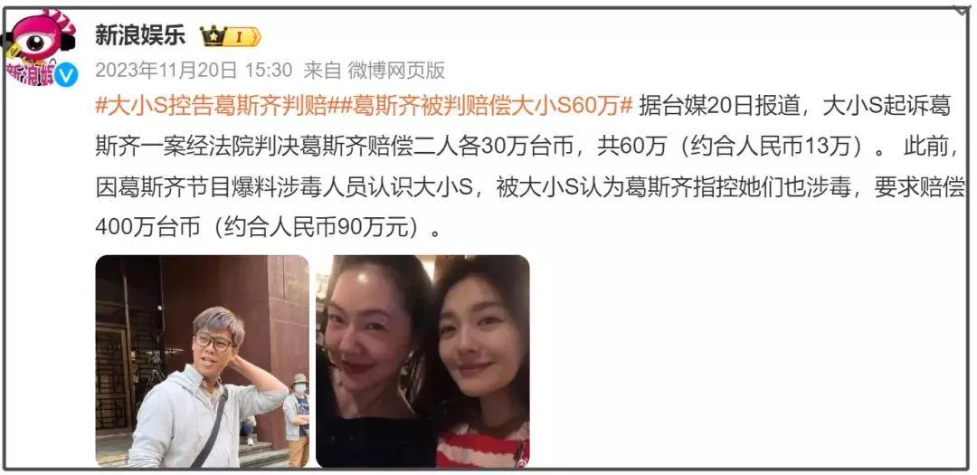 大S生前饱受话题争议,一方面是因为和汪小菲之间的离婚风波,另一方面就是被黄子佼直播爆料大小S两姐妹吸毒。当时葛斯齐在黄子佼之后也上节目爆料过此事,但最后葛斯齐被大小S起诉,输了官司被判赔偿60万台币(人民币约13万)。