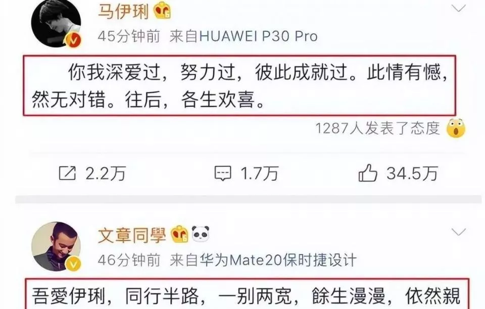 姚笛宣布好消息之后,文章和马伊琍也同步公布了离婚的消息。