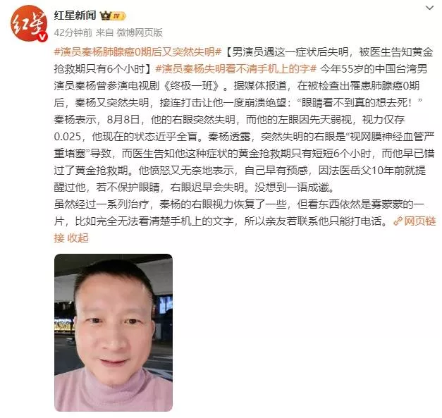 秦杨表示,8月8日,他的右眼突然失明,而他的左眼因先天弱视,视力仅存0.025,他现在的状态近乎全盲。秦杨透露,突然失明的右眼是“视网膜神经血管严重堵塞”导致,而医生告知他这种症状的黄金抢救期只有短短6个小时,而他早已错过了黄金抢救期。他愤怒又无奈地表示,自己早有预感,因法医岳父10年前就提醒过他,若不保护眼睛,右眼迟早会失明。没想到一语成谶。