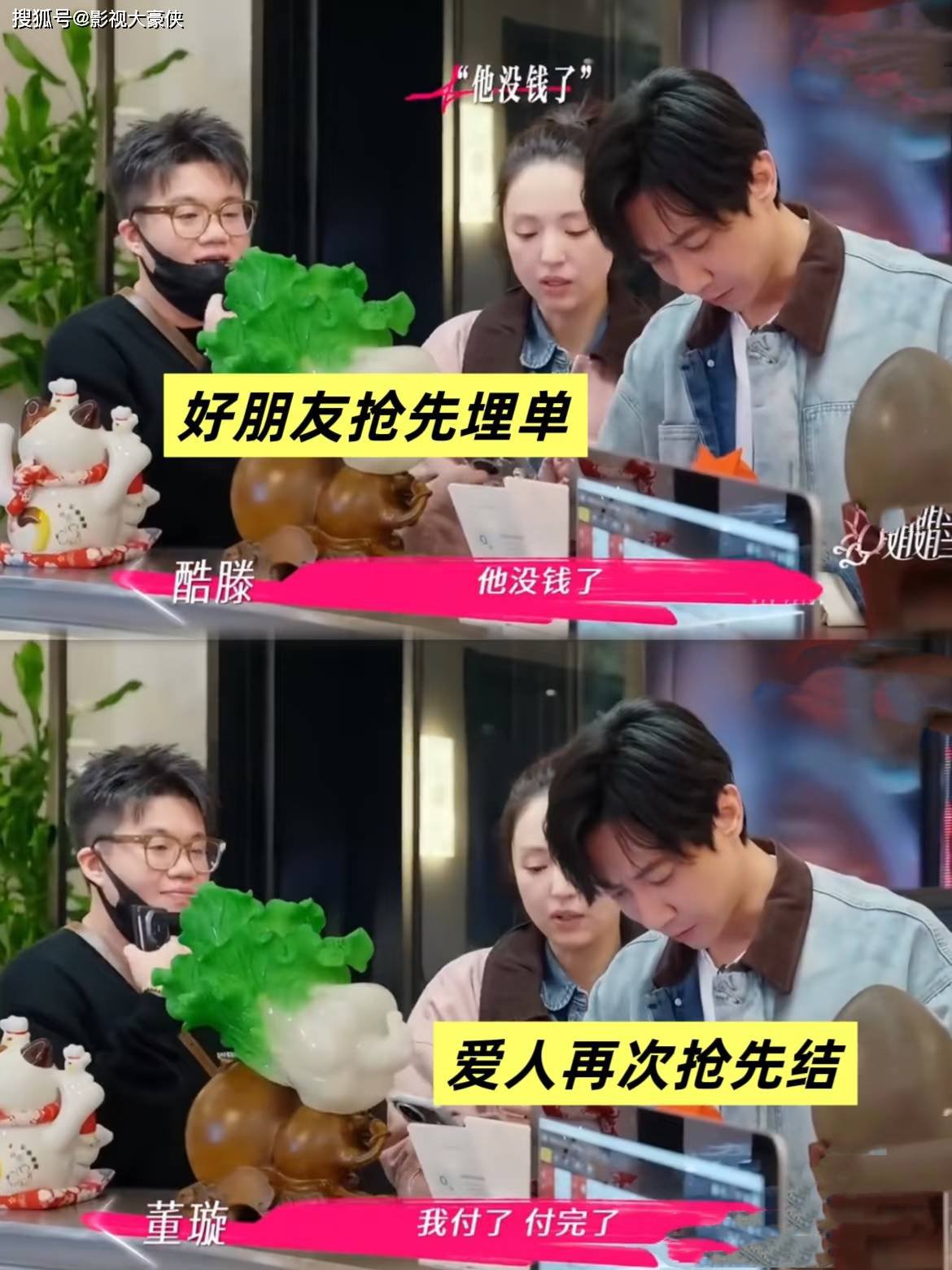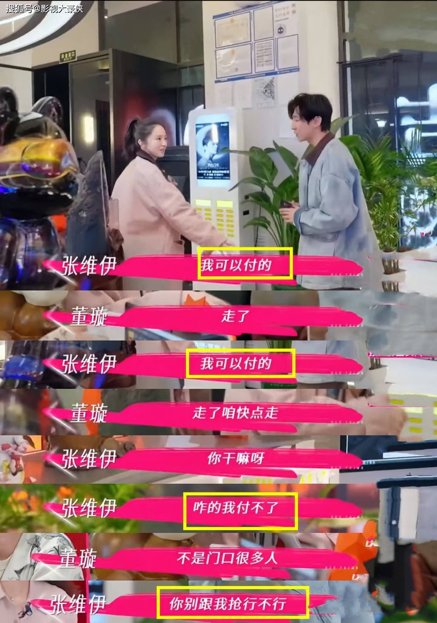 董璇也不知道看到了男方的什么东西,表情很抢镜,有人说这估计是看到张维伊也没多少钱了的表情,酷滕不知道看到什么一直在旁边说“他没钱了”,这个时候男方的尊严简直是被拿在地上摩擦,所以更是狠心要买单,捣鼓很久都不行,然后董璇就买单了,因为外面一堆人在等着呢,结果这时候张维伊闹脾气了,男人自尊上来了,一直无理取闹的让服务员给钱退了,然后自己付。网友们一直揣测,正常来说付钱不会这么久,3秒就行,捣鼓这么久要么张维伊没有钱了,要么就是在用券,但是外边那么多朋友在等着,她们夫妻既然决定请客,就该在饭间去买单,而不是散场后,最后朋友都看不下去了。