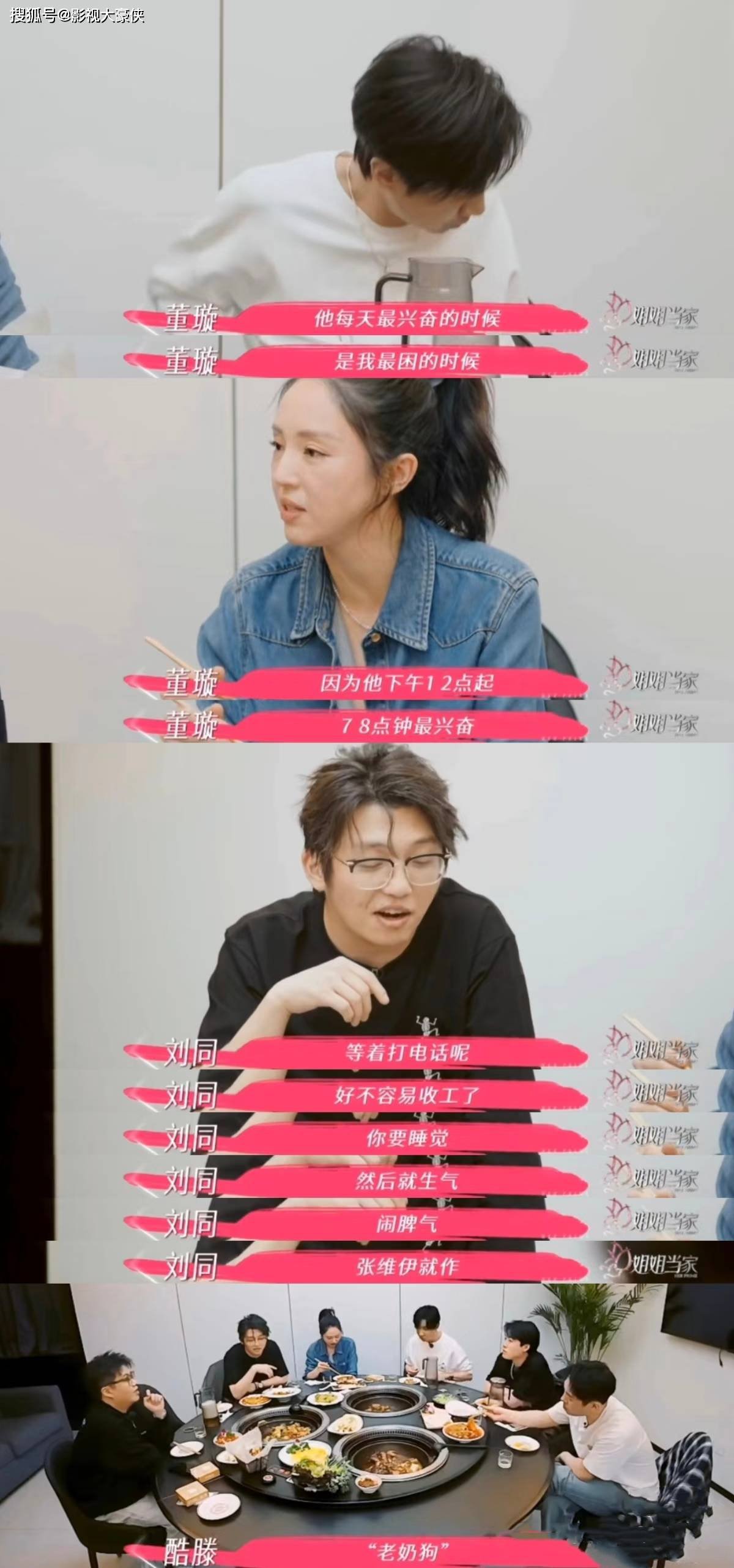 近日,董璇和张维伊相差9岁的恋情引起关注,两人一个头婚,一个二婚,看起来却比新婚夫妻还要抓马,完全处理不了任何事情。像最近两人宴请了朋友,结果在饭桌上两人的私生活就被拿来吐槽了,董璇告诉大家:男方7、8点最兴奋,12点睡醒,然而对方最兴奋的时间就是自己最困的时间。刘同算是比较理解的,他说那个时候张维伊刚收工呢,就想打电话,结果没想到你睡觉了,他就会炸!酷滕的“老奶狗”直接点燃了张维伊的情绪,所以在买单的时候,就比较强迫性的一定要买单。