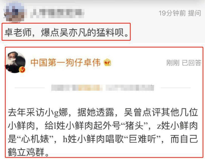 卓伟直接留言其给圈内的明星起外号,甚至评价h姓歌手“巨难听”,而他则是“鹤立鸡群”,直至吴亦凡入狱,才懂得卓伟的良苦用心。
