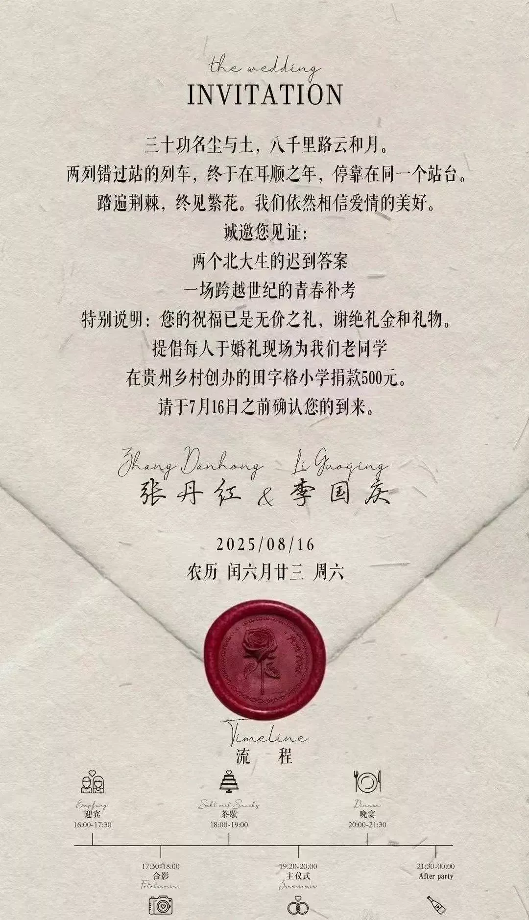 今年6月,有网友晒出当当创始人李国庆的结婚请柬,请柬显示婚礼将于2025年8月16日北京举办,女方是其北大校友。请柬显示,“谢绝礼金和礼物,提倡每人于婚礼现场为我们老同学在贵州乡村创办的田字格小学捐款500元”。