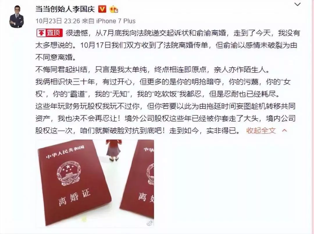随后,李国庆发布微博称向法院起诉离婚,但妻子俞渝不同意,称“玩财务玩股权我玩不过你,但你若要以此为由拖延时间妄图趁机转移共同资产,我也决不会再忍让。”