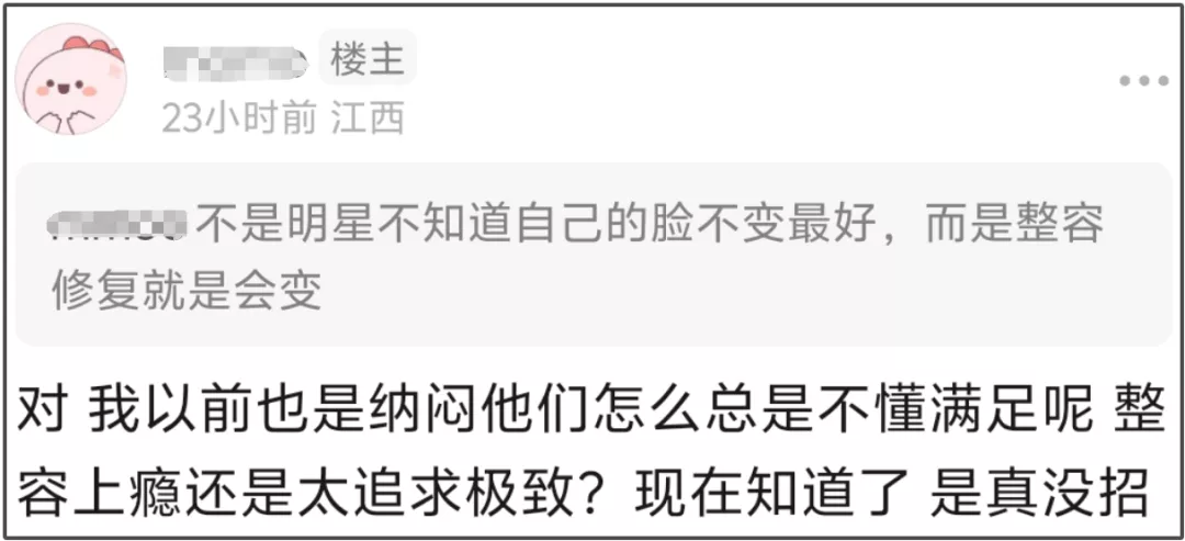 正如网友所说,原来有时候明星不是不知道自己整坏了,而是没招了,再后悔也变不回去了,最后就希望大家不要容貌焦虑啦,明星整容勉强算是职业需要,普通人图啥呢?