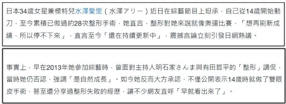 用水泽爱里自己的话说,那就是整容多了会有竞争感,想着不断刷新纪录,根本停不下来。