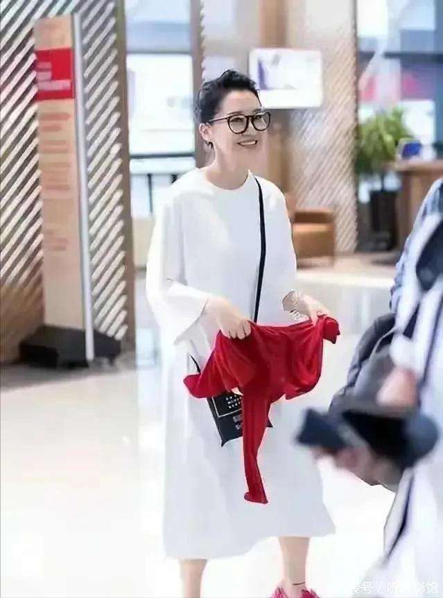 但是从整体来看,整个人十分的臃肿,一身宽大的服饰更显肥胖,手里还拿着一件红色的外衫,估计是怕飞机上太冷容易着凉。