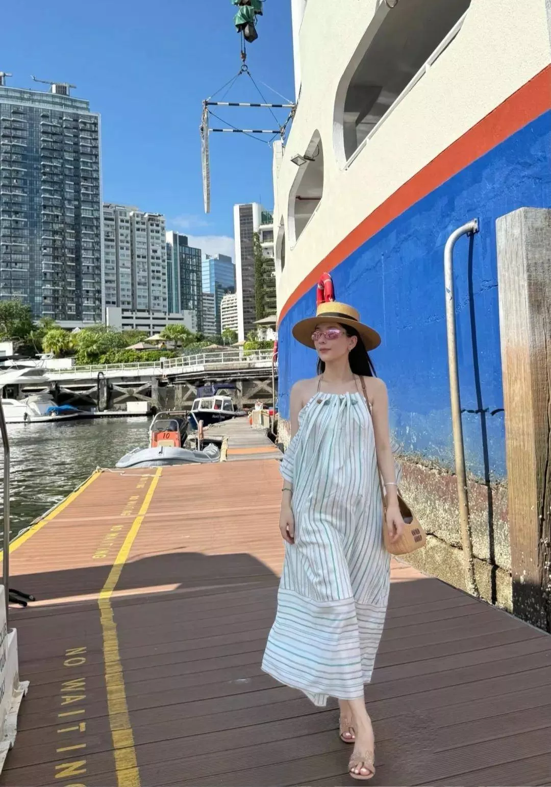 在码头拍照时,方媛还穿着高跟拖鞋,虽然跟不算太高,但临近水边,穿拖鞋总归不太安全。不过,孕妇的心情最为重要,方媛整个孕期一直保持得体打扮,既天生丽质,又状态优越,保持着好心情。