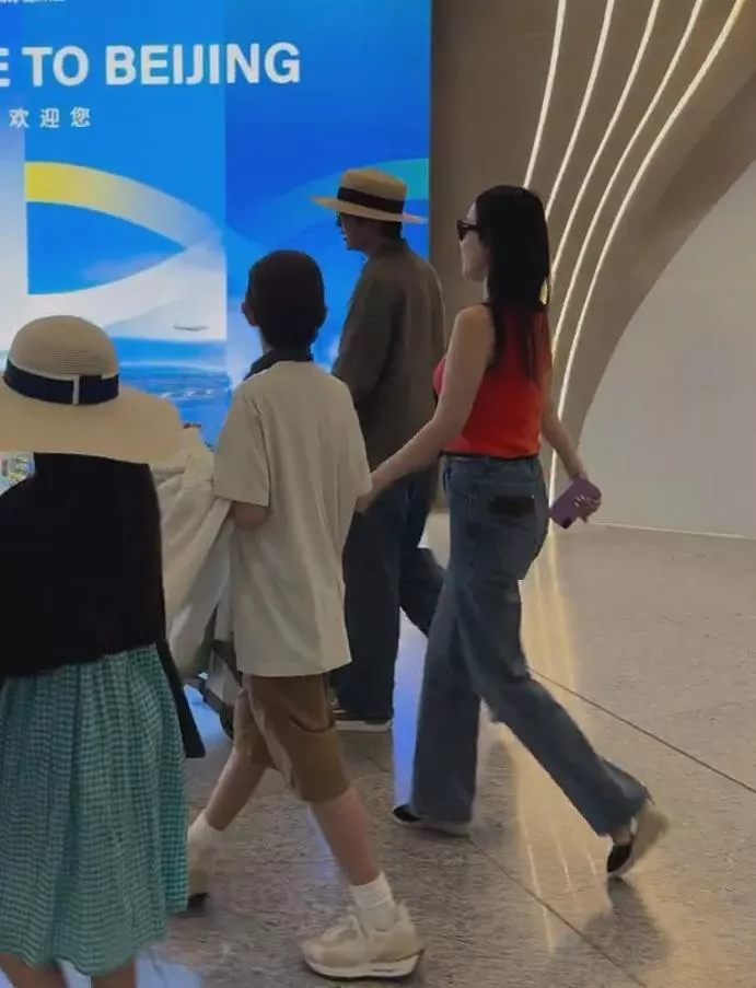 杜江和嗯哼负责推行李,霍思燕大步流星向前走,一旁的小女孩穿着蓝色格子裙,头戴宽檐帽,完全是小公主外出度假的穿搭。