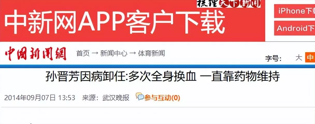 信息来源:2014年9月7日 中国新闻网 孙晋芳因病卸任:多次全身换血 一直靠药物维持信息来源:2014年9月7日 中国新闻网 孙晋芳因病卸任:多次全身换血 一直靠药物维持