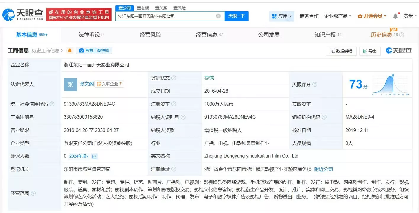 搜狐娱乐讯 据天眼查天眼风险信息显示,近日,浙江东阳一画开天影业有限公司新增一则股权冻结信息,被执行人为演员张翰,冻结股权数额165万人民币,冻结期限为3年,执行法院为上海市浦东新区人民法院。