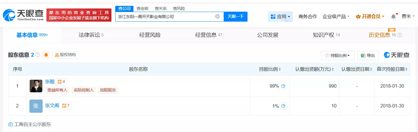 该公司成立于2016年4月,法定代表人为张文阁,注册资本1000万人民币,经营范围包括影视类网络数字技术服务、组织策划综艺文化活动、艺人经纪等。股东信息显示,该公司由张翰、张文阁分别持股99%、1%。